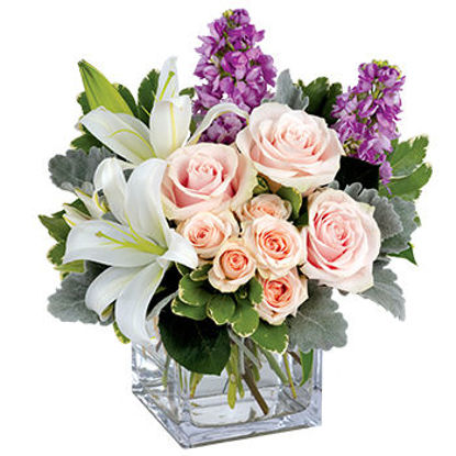 Straight off an impressionist's canvas, this muted masterpiece is a marvel of pale pink roses , snow white lilies and purple stock.