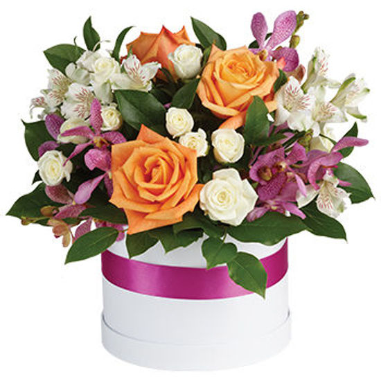 Take for example, our sizzling floral arrangement that is sure to catch the eye. It is a dynamic display of purple orchids, white roses, and bright orange roses all perfectly placed in a sleek container. The striking contrast of colours creates a mesmerizing effect that will leave a lasting impression.